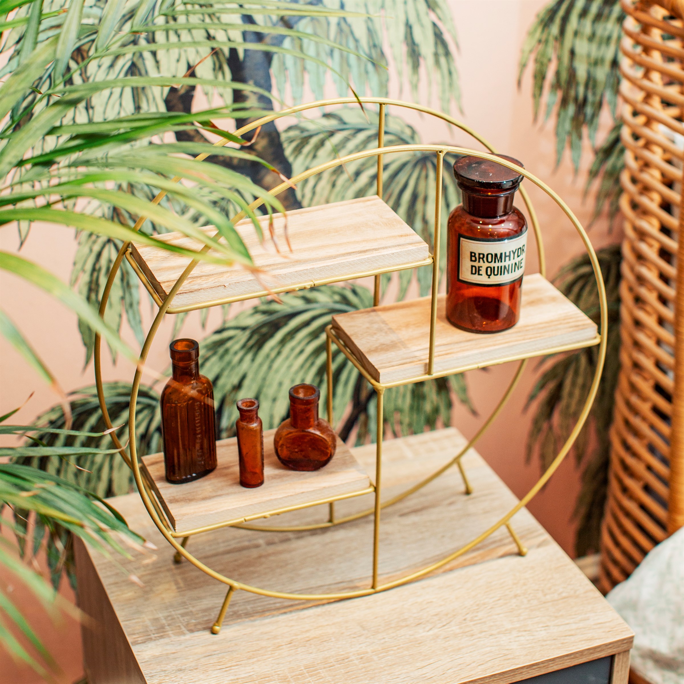 This antique gold shelf features four little legs for standing and three platforms to decorate or leave minimal. The minimal design makes it a versatile piece for the home.