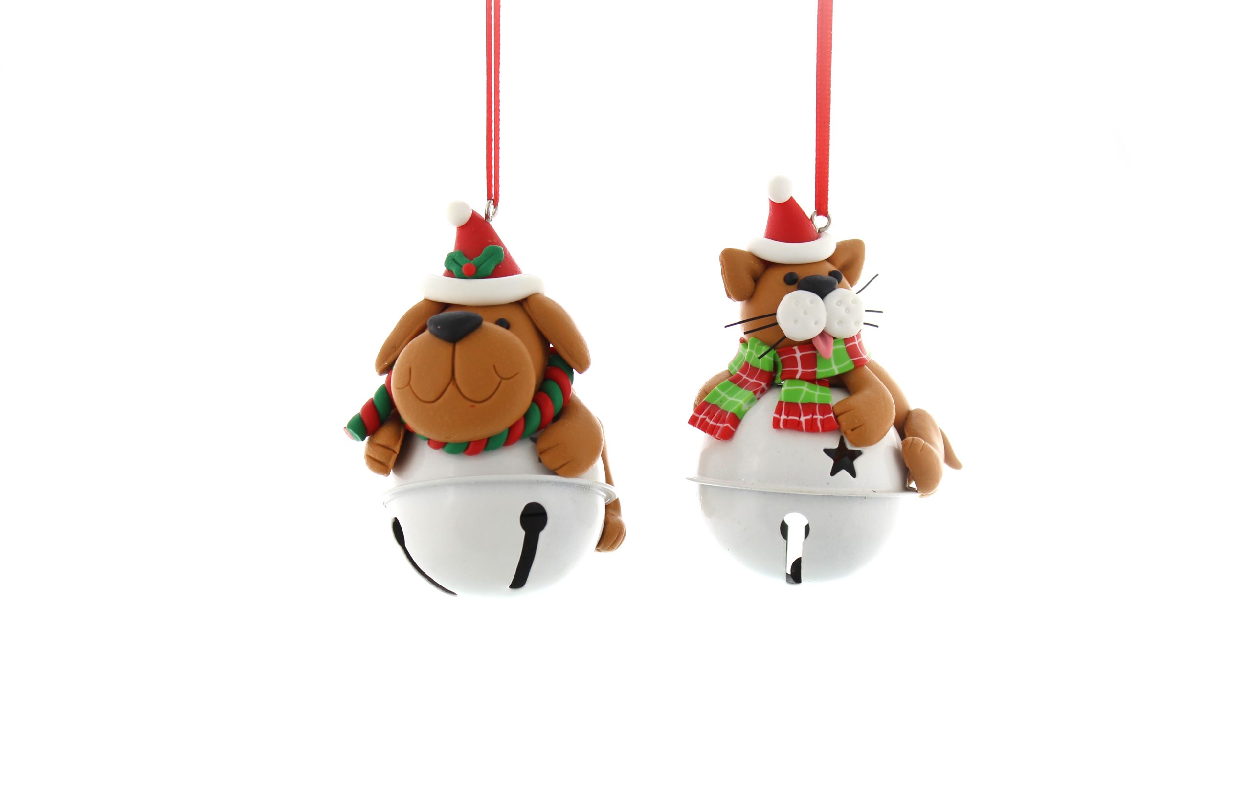 9cm claydough cat and dog sitting on white metal jingle bell hanging decoration