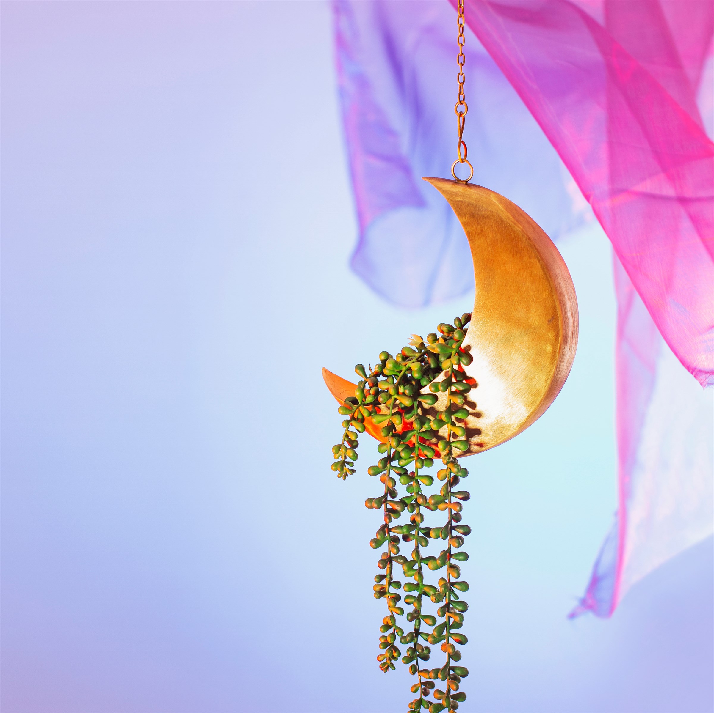 This hanging Celestial planter is shaped as a luxe crescent moon in an inspiring galaxy gold and features a handy hanging chain and hook.