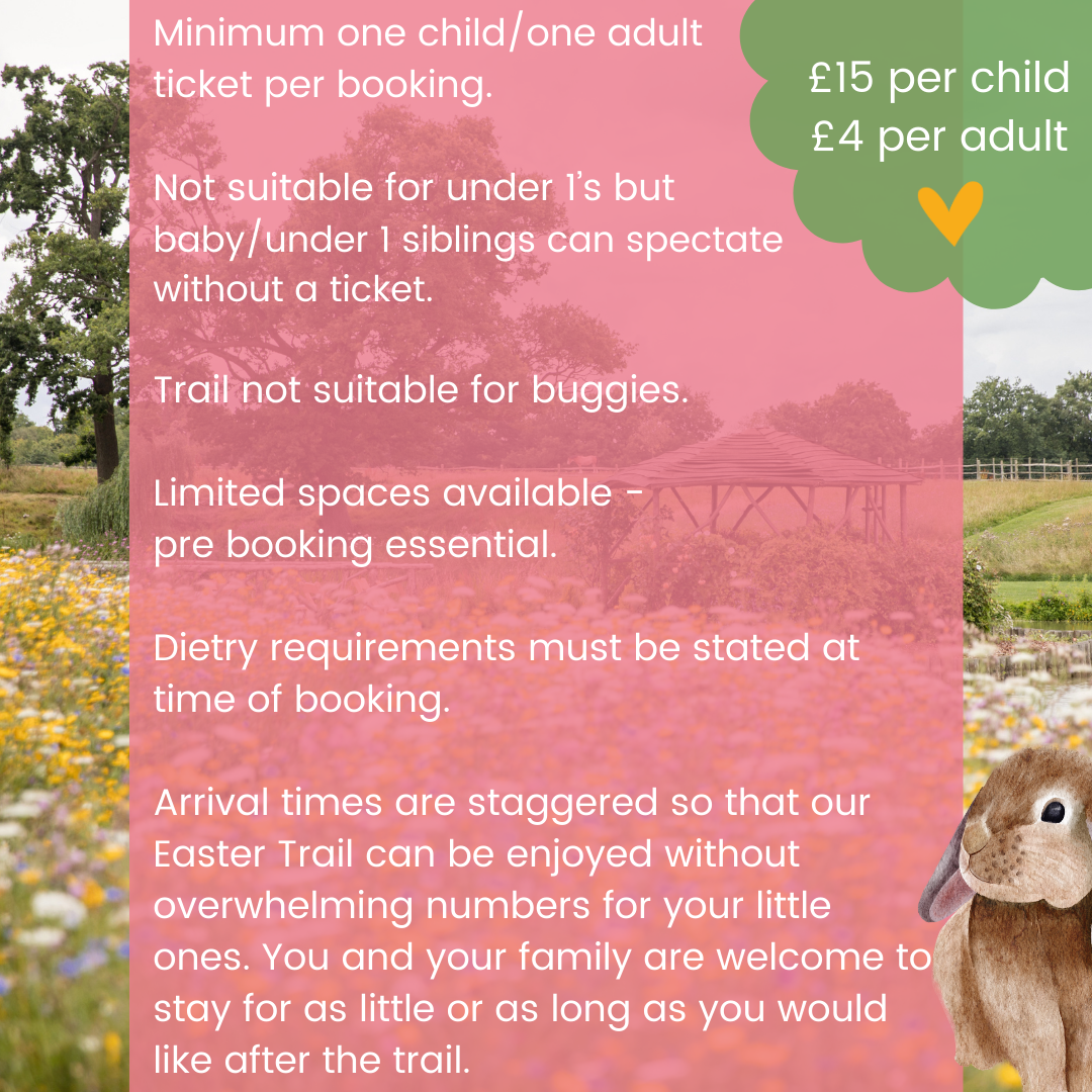 Arrival times are staggered so that our Easter Trail can be enjoyed without overwhelming numbers for your little ones. If you are coming with friends then please note that there is only one booking available per time slot, so please combine your tickets on to one order.