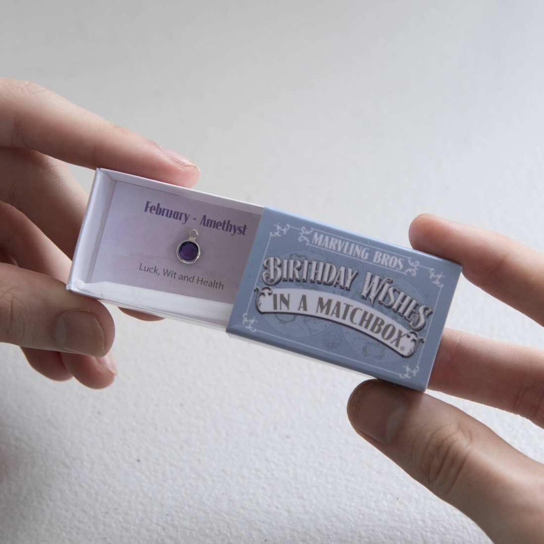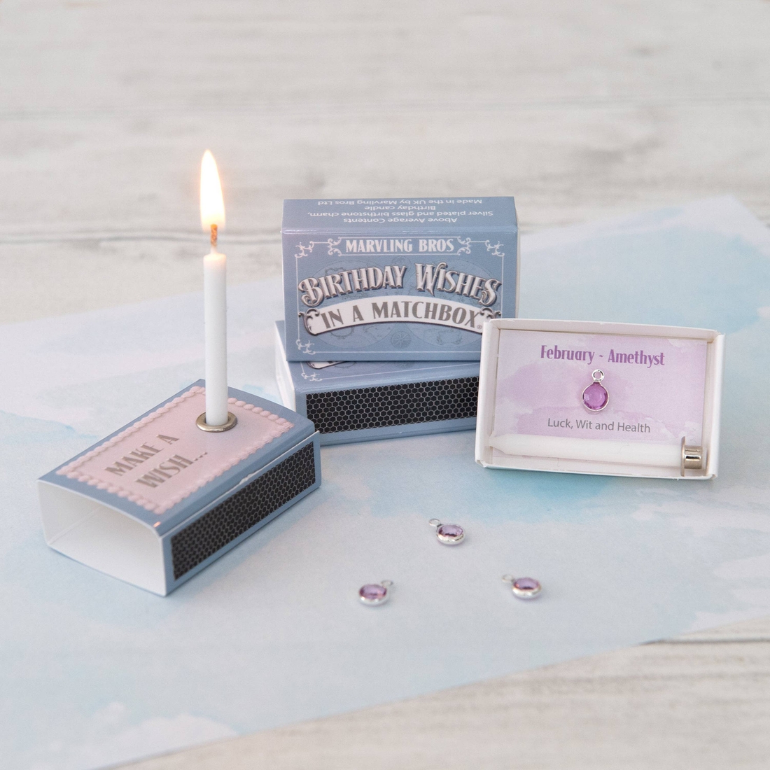 Celebrate the moment with this beautiful birthday message in a matchbox, containing a February birthstone charm and all important birthday candle.