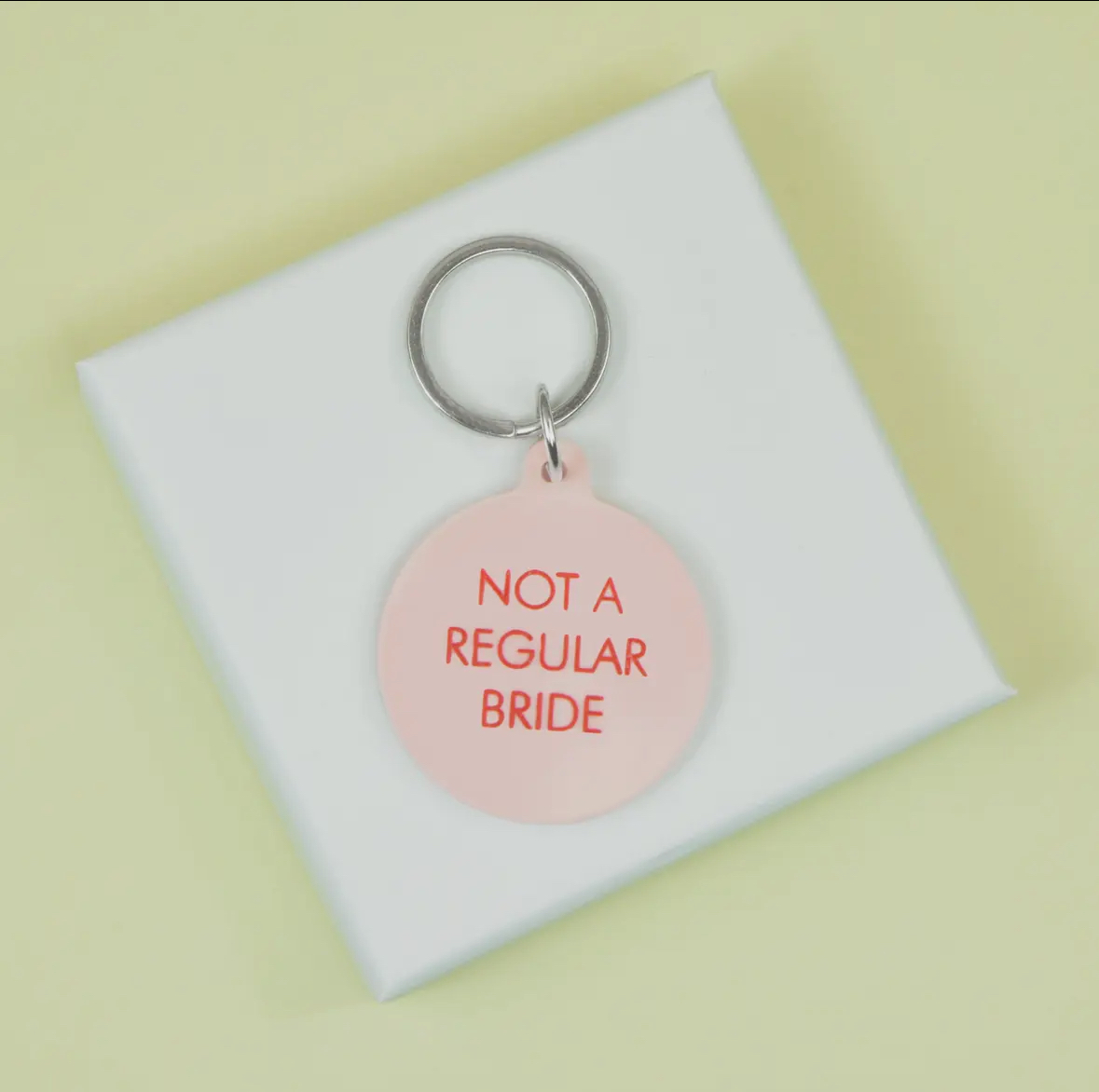 ‘Not a Regular Bride’ engraved on pastel pink acrylic with red text and a silver keyring.