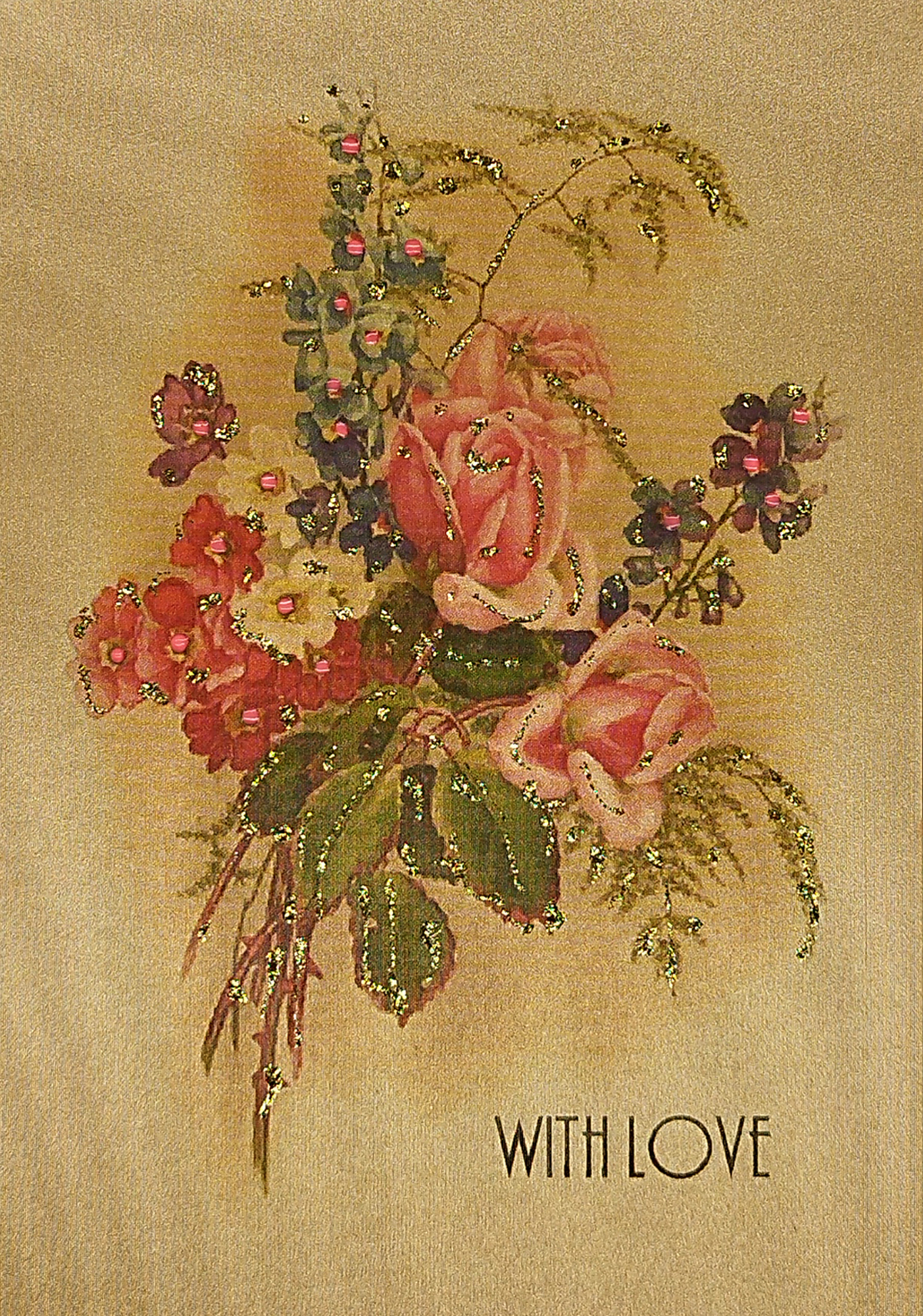 Vintage postcard images individually printed onto shimmering board and then HAND PAINTED and embellished with crystals. Each card is supplied with a complementing envelope. Card size = 15cm x 10.5cm